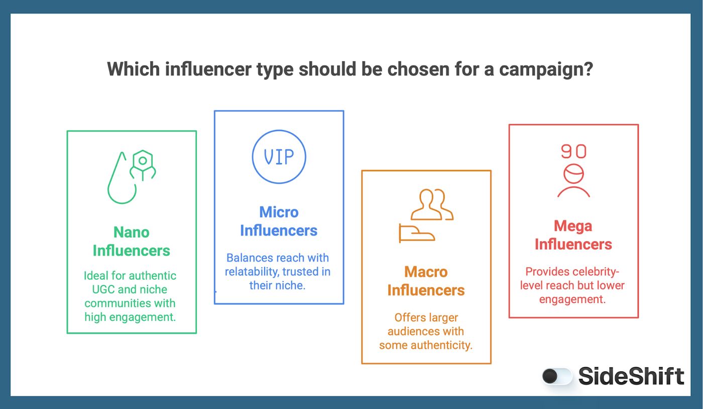 In short, whenever your goal is targeted growth, authentic engagement, or tangible results, micro-influencers offer a flexible, high-impact solution. Platforms like SideShift make it easy to connect with vetted creators, run UGC campaigns at scale, and give both brands and influencers the tools to grow together efficiently. Ready to elevate your brand with authentic creator content? Get started with SideShift today.