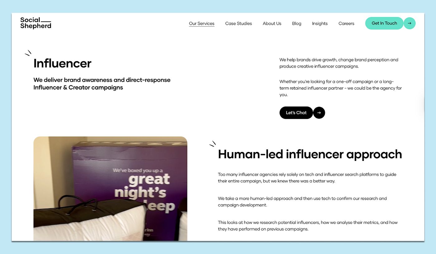 Where they stand out is integration. Instead of handing brands a folder of videos and moving on, The Social Shepherd plugs that content straight into managed performance campaigns. Their team handles campaign ideation, scriptwriting, production, post-production, and ongoing analysis, then optimizes ad spend by testing variations and scaling what works.
